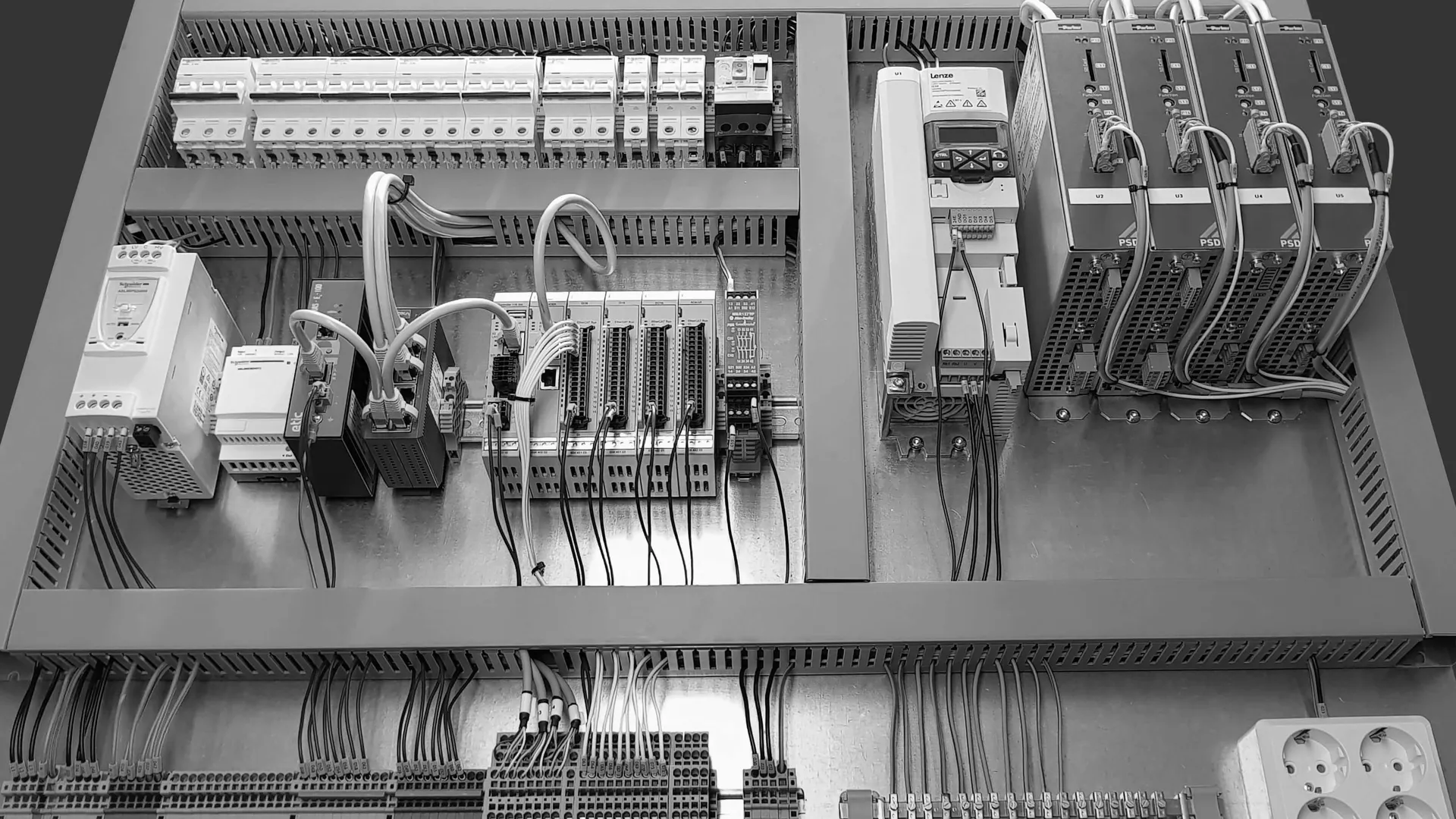 Våra el-, pneumatik- och styrskåp byggs med komponenter från välkända fabrikat och märken av förstklassig kvalitet. Layouten planeras omsorgsfullt och med service och underhåll i åtanke.